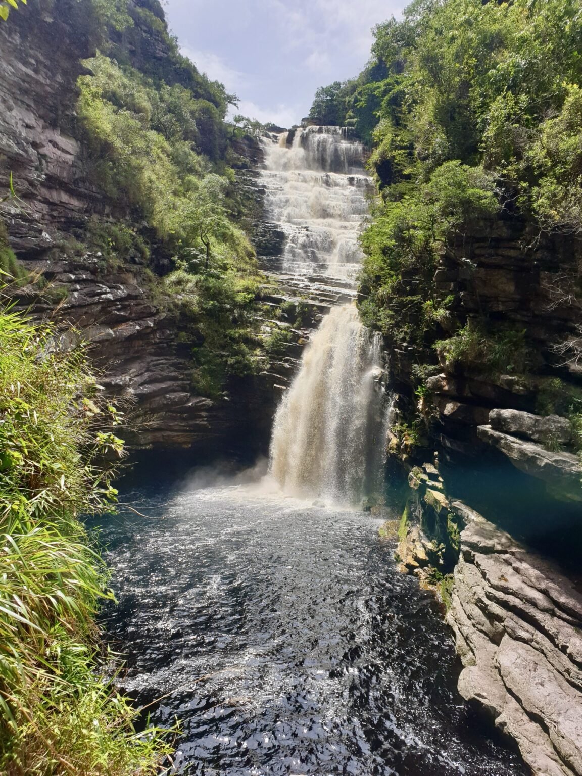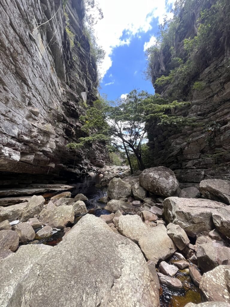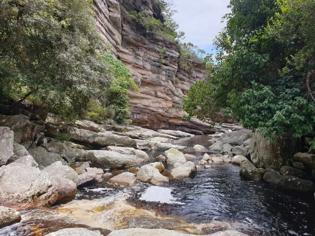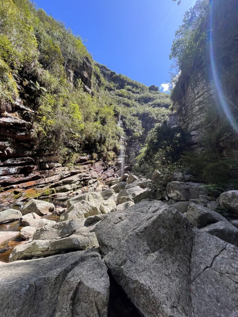 Dopo due ore di cammino, spesso in silenzio rotto solo dal suono del fiume e dei propri passi, si comincia a sentire l’acqua più vicina. Un’ultima curva e una discesa tra le rocce conducono alla Cachoeira do Sossego, alta e potente, incastonata tra pareti verticali. L’acqua cade con forza in una piscina profonda e scura, circondata da rocce levigate.