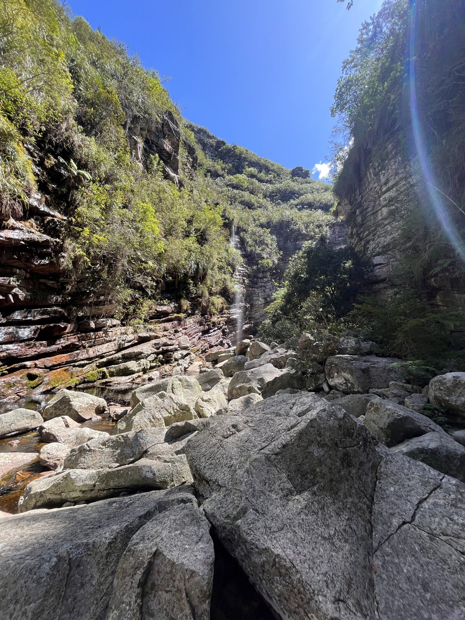 Dopo la pausa, si ritorna lungo lo stesso sentiero, con passo più sciolto. La luce del pomeriggio trasforma i colori del paesaggio. A metà strada, si devia verso il Ribeirão do Meio, a circa 3 km da Lençóis, dove si trova uno scivolo naturale di pietra liscia che termina in una piscina.